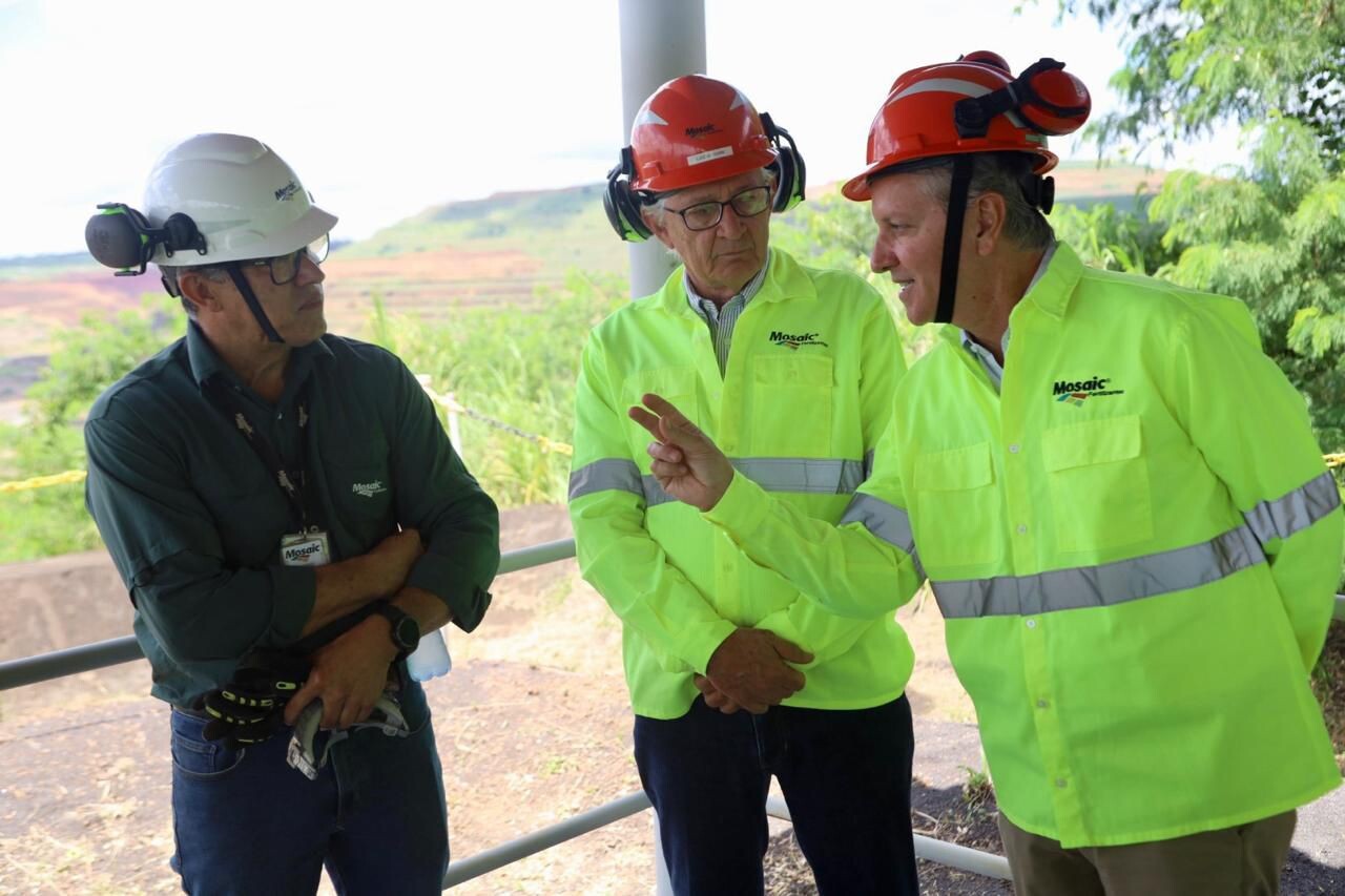 O secretário Joel Sant’Anna, Luiz Vessani e André Rocha em visita à mineradora Mosaic, em Catalão (Foto: Cristóvão Matos/SIC